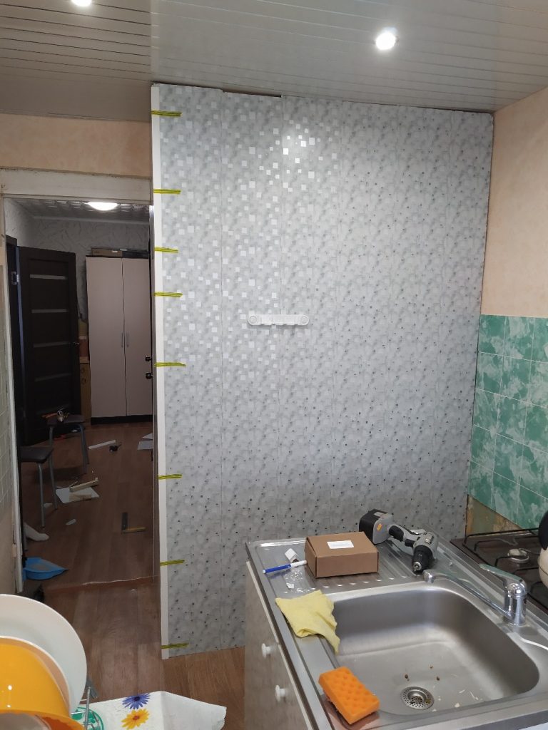 Парень решил переделать в кухне потолок, стены и фартук и поставить новый кухонный гарнитур. Конечно, получилось не все, но ведь хозяин квартиры — не строитель и молоток в руках держал чуть ли не первый раз. Зато на кухню теперь приятно зайти. Да и сам ремонт получился бюджетным и не затяжным.