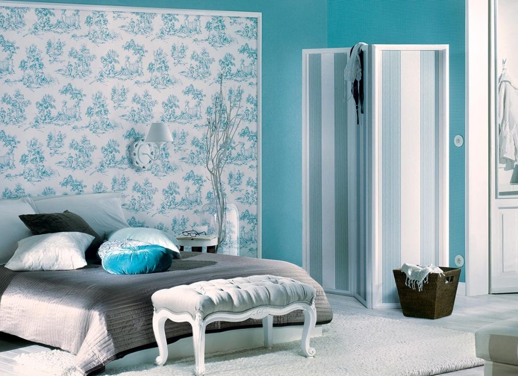 - игра на контрастах – выделение обоями с крупным узором только одной стены, например, прилегающей к изголовью;